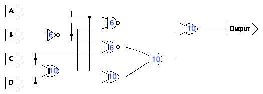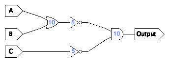 - Find the propagation delay for each input/output combination in this circuit assuming all gates have a propagation delay of 10. (You will have six answers):